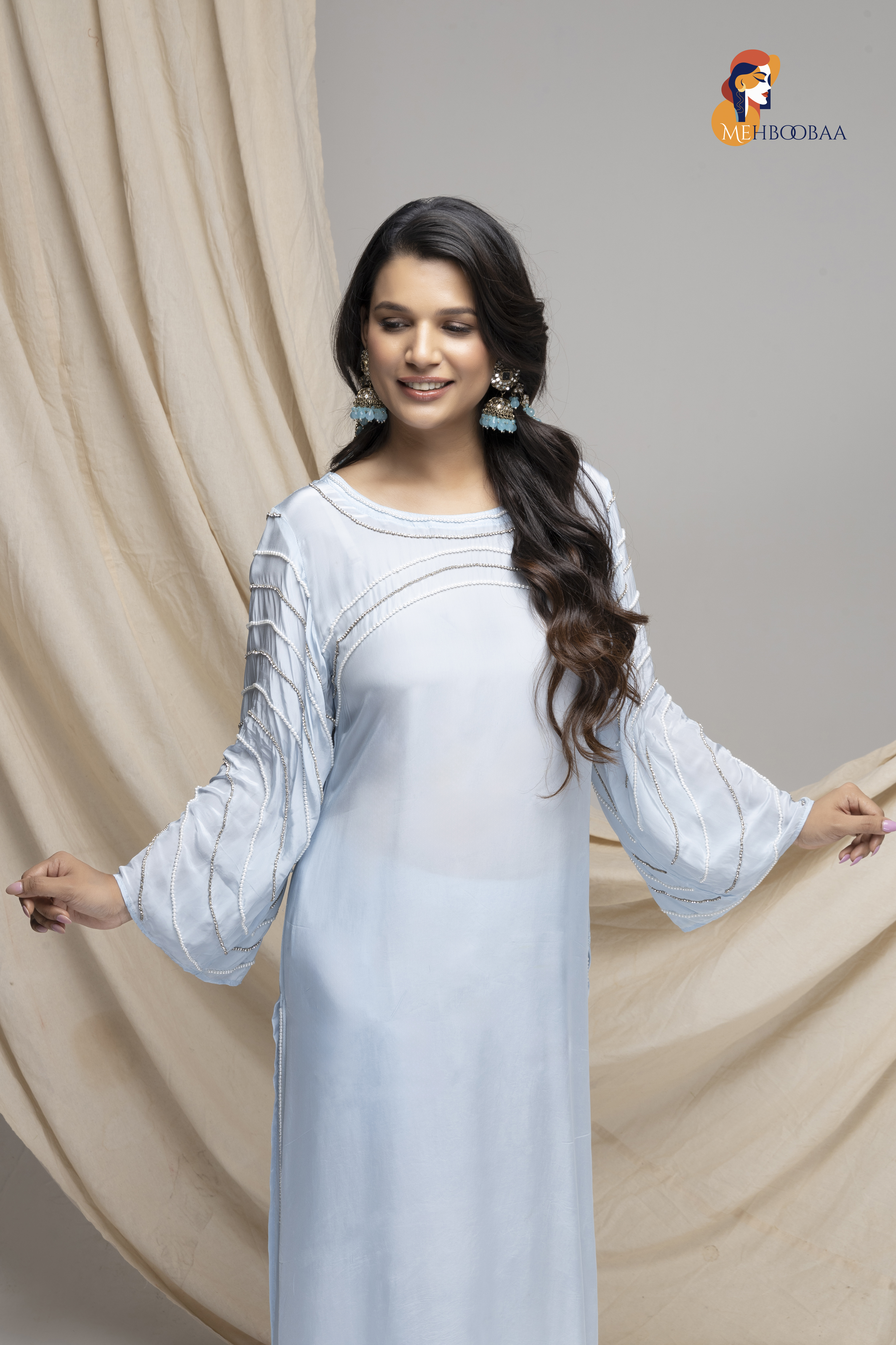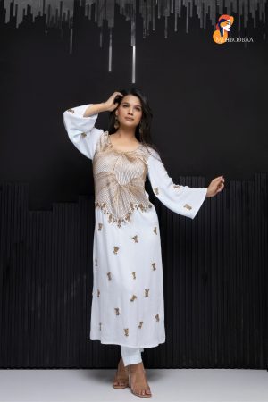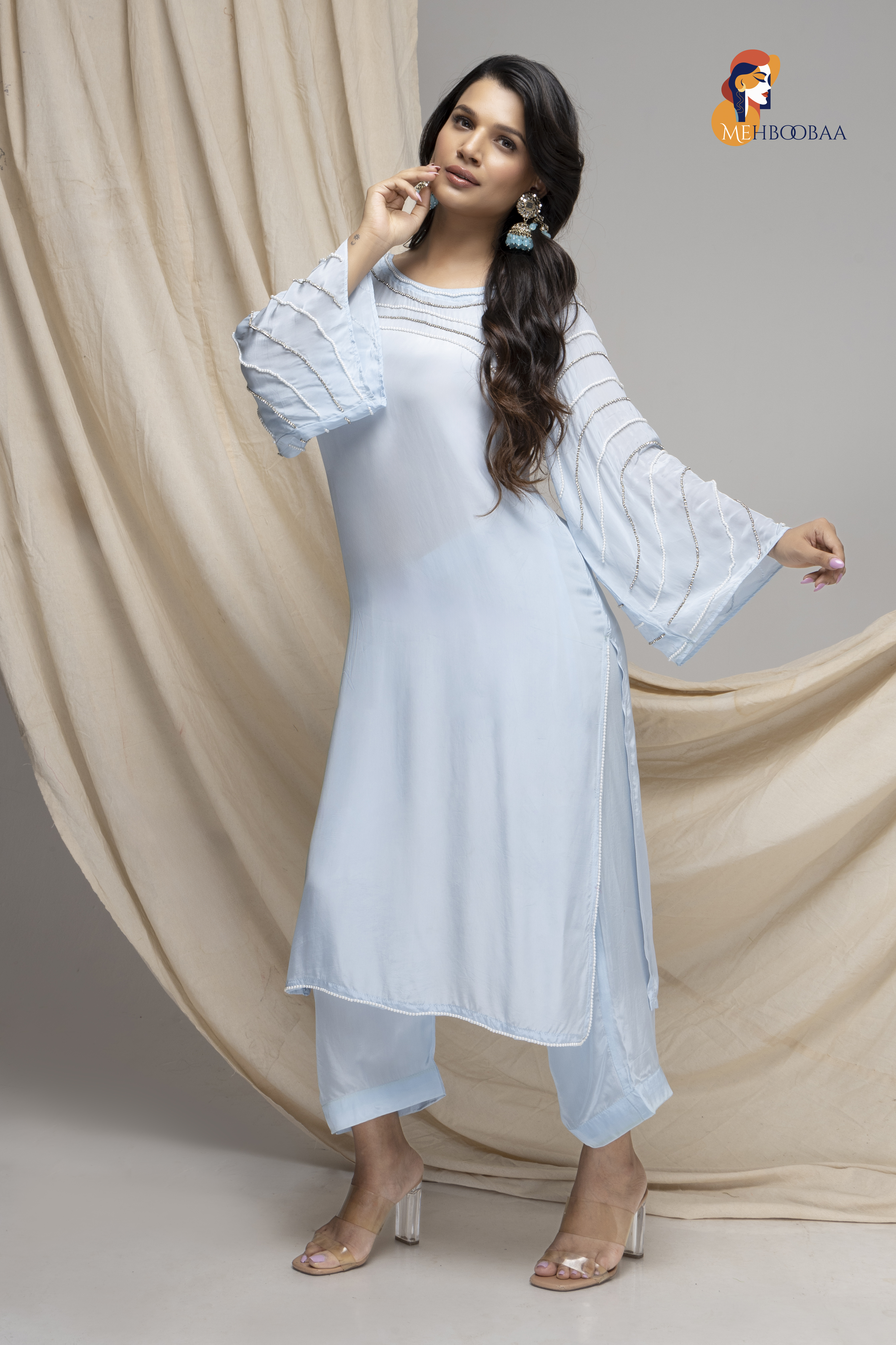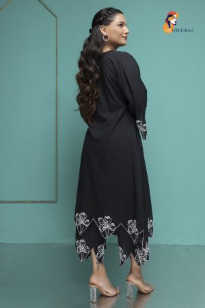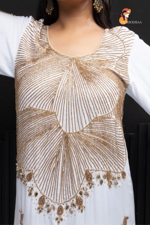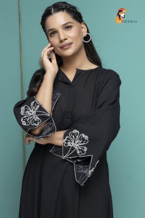 Shop Now the Mehbooba Twinkling Dreams Handcrafted Crepe Suitt, a beautiful addition to your wardrobe! Made from soft crepe fabric, this suit feels lovely against your skin and is perfect for any occasion. The stunning aari work with beads and pearls adds a magical touch, making you shine bright like a star. Each suit is handmade by skilled artisans, taking 3-4 days to complete. No machines are involved, so every piece is unique and special.