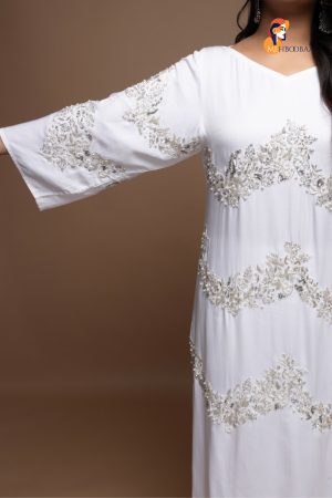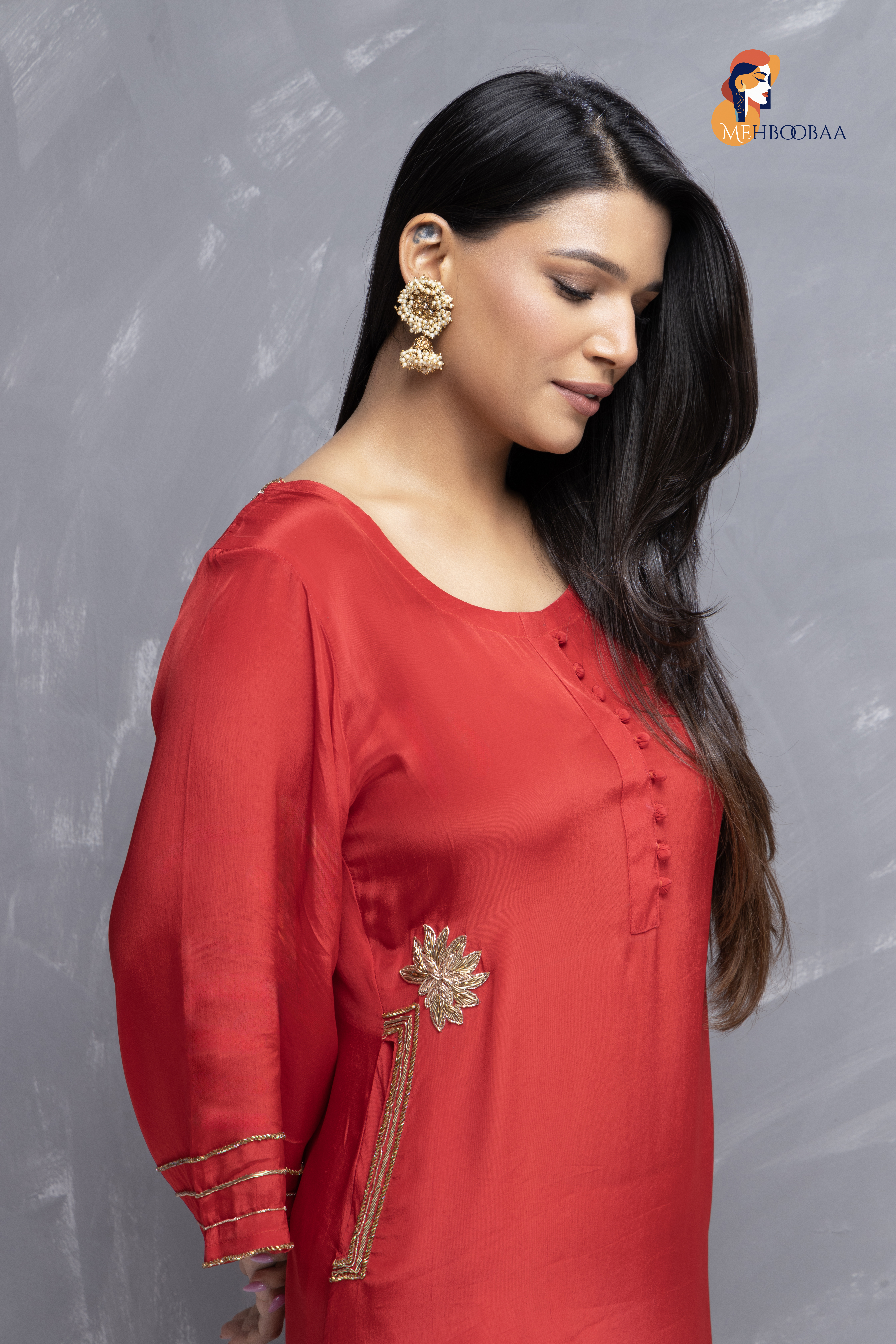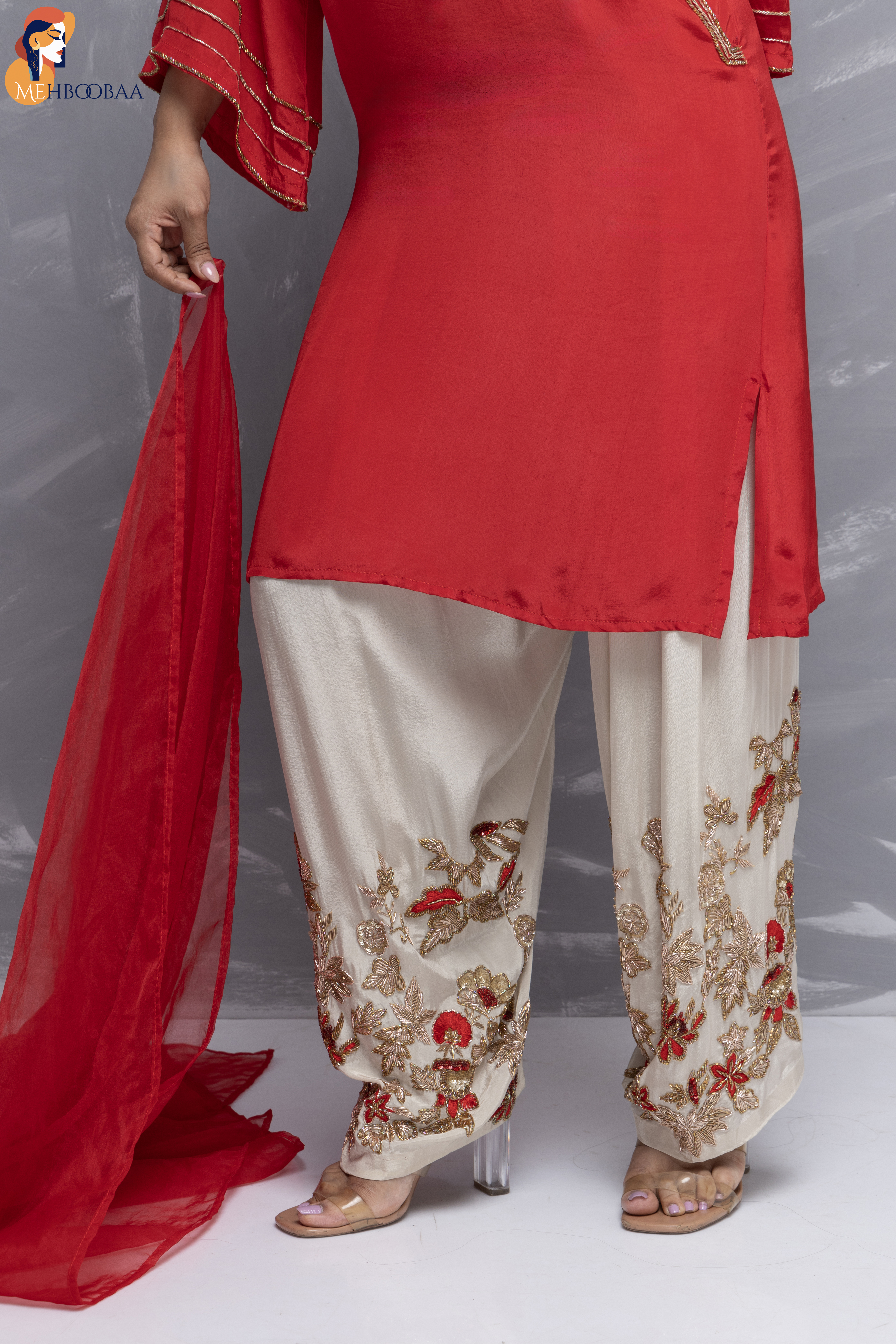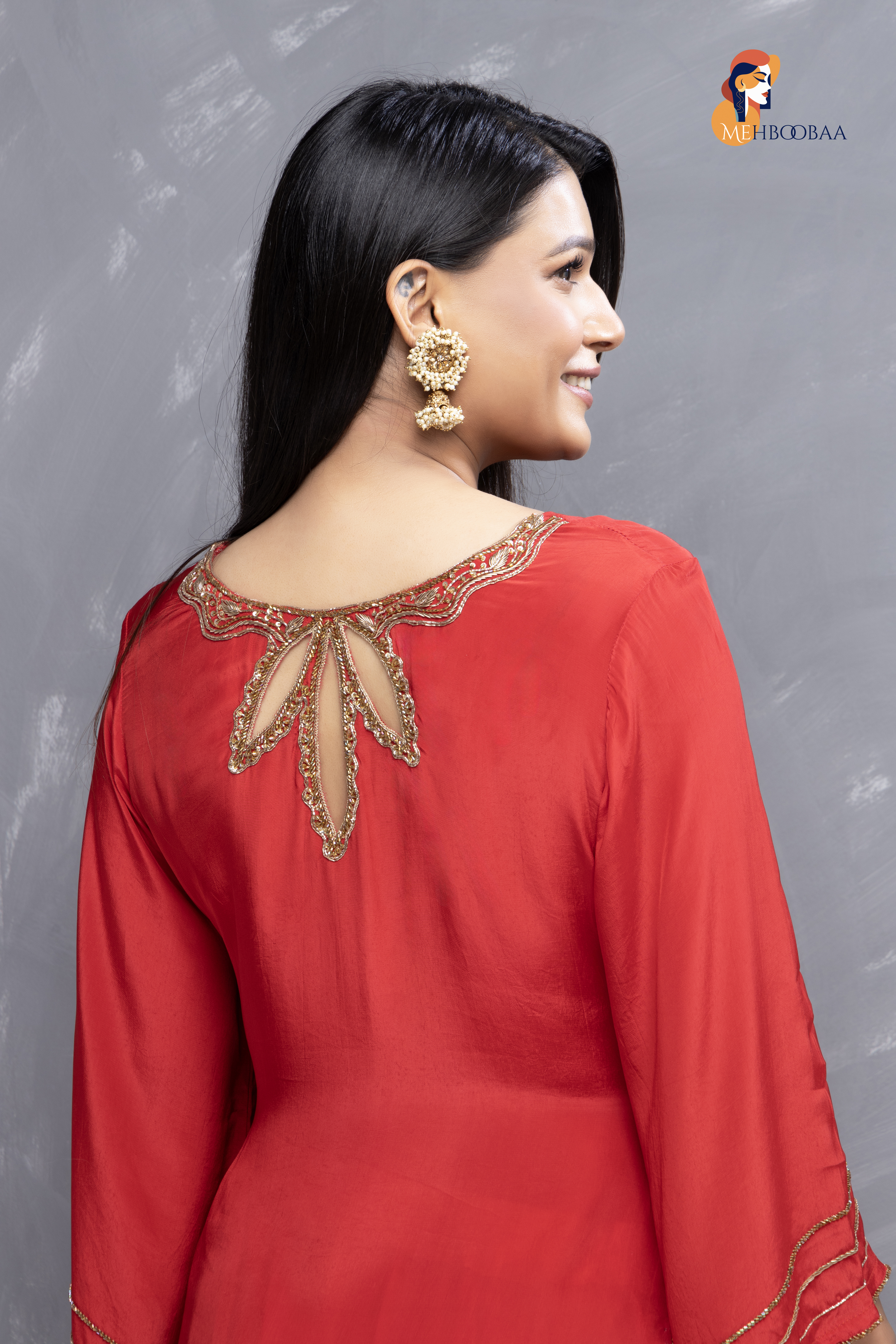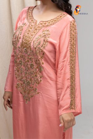 Embellished with intricate zardozi dapka and nakshi work, this suit exudes timeless sophistication and regal charm. Crafted from soft yet durable crepe for both the top and bottom, it is designed to fit any body type, making it perfect for any occasion. The lightweight fabric provides a flattering fit while ensuring all-day comfort, whether you’re attending a festive gathering or a special celebration. The sheer organza silk dupatta adds a touch of ethereal grace, with its soft flow and delicate shimmer complementing the rich crepe suit. The suit set comes with side slits and a comfortable fit, allowing for easy movement and ensuring you feel as graceful as you look. Crafted to last, the premium fabrics and detailed craftsmanship guarantee that your suit stays elegant for years to come. Each suit is lovingly handcrafted, reflecting the dedication and precision of our skilled artisans, who bring every detail to life.