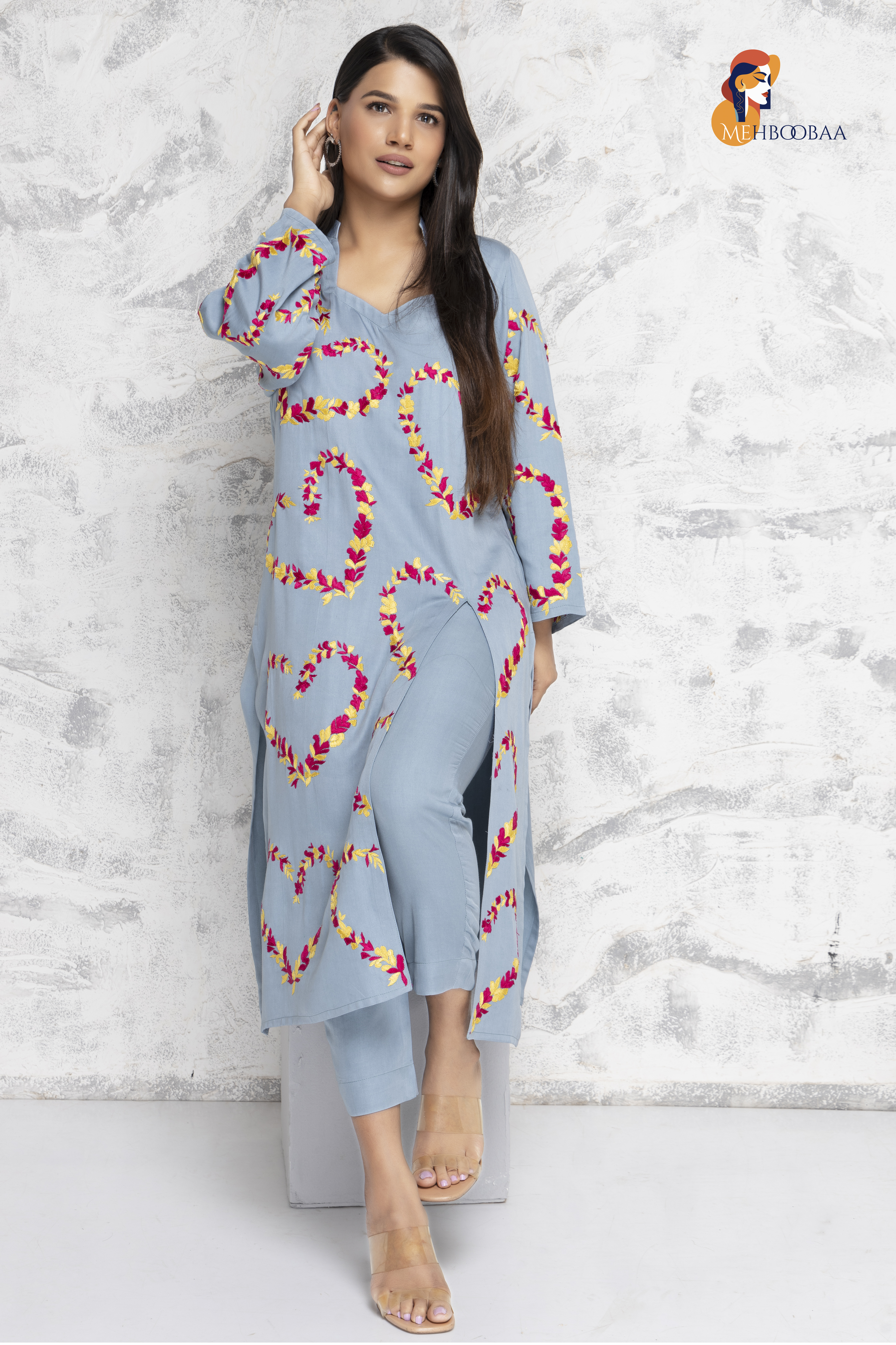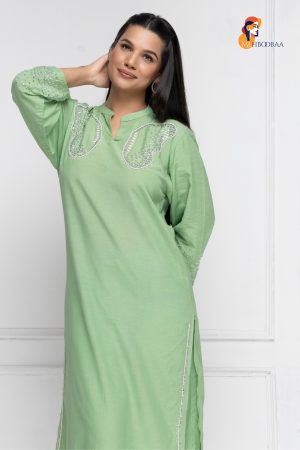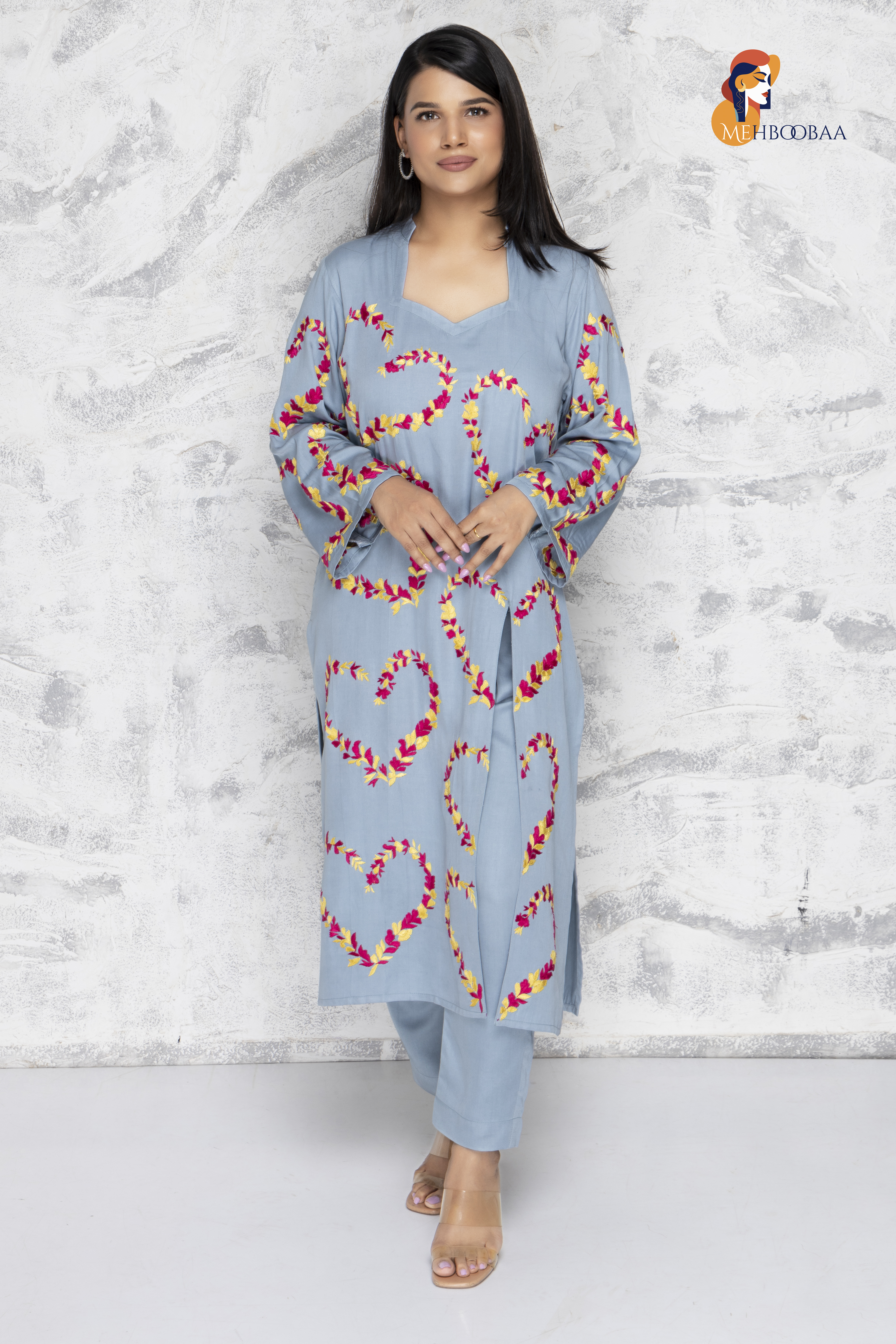 Step into timeless beauty with the Eternal Love handcrafted suit. The heart-shaped zardozi resham work, stitched by expert artisans, radiates elegance and charm. Each suit is a labor of love, taking 3-4 days to make without any machine work. Crafted from 100% pure cotton, this fabric is both luxurious and durable, designed to last for years.