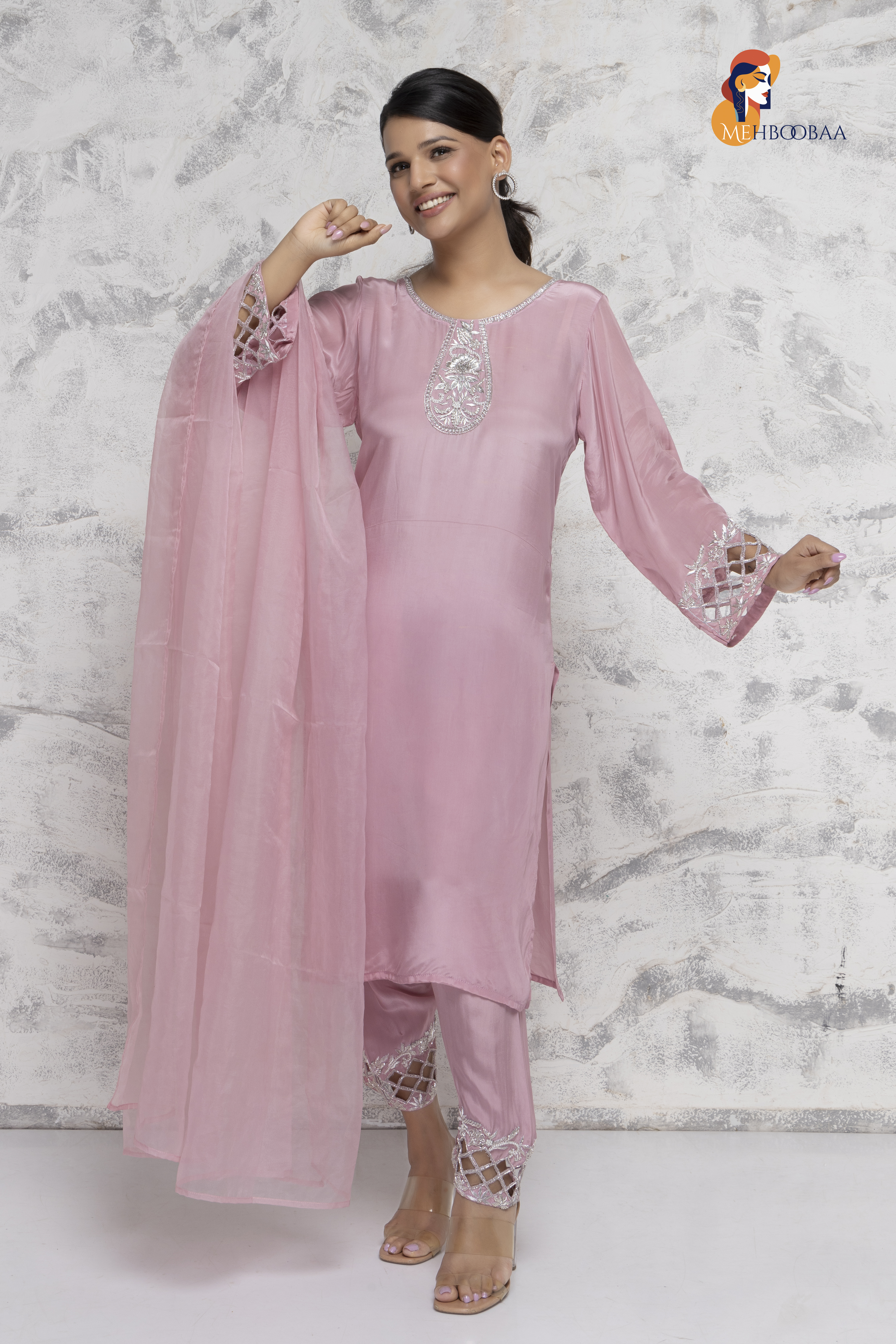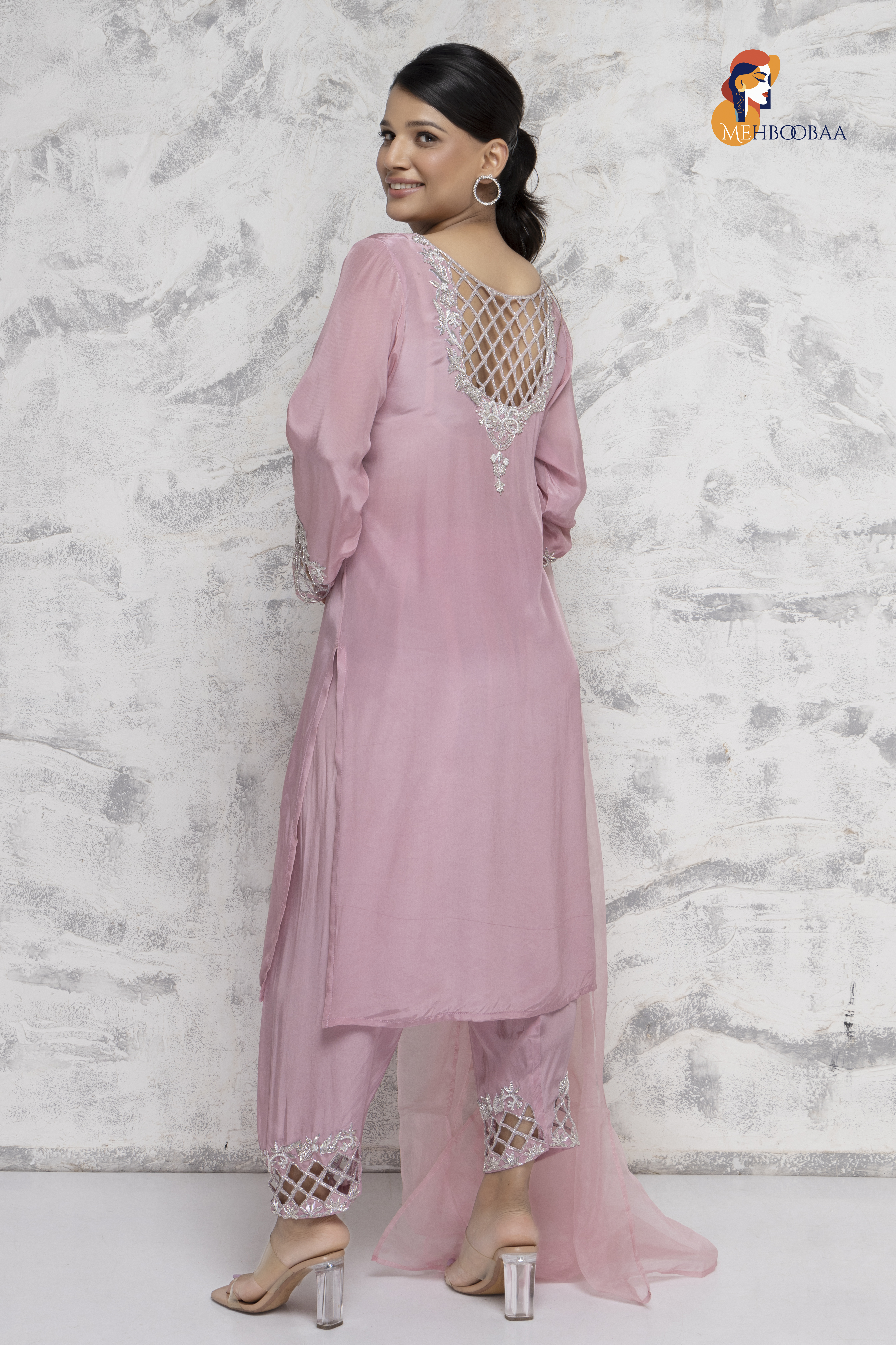 The pure organza tissue dupatta adds a delicate, royal touch. The crepe fabric not only feels luxurious but is designed to enhance your figure, giving you a slimmer look. This suit isn’t just clothing; it’s a piece that can be passed down through generations, just like the treasured pieces your nani or maa wore.